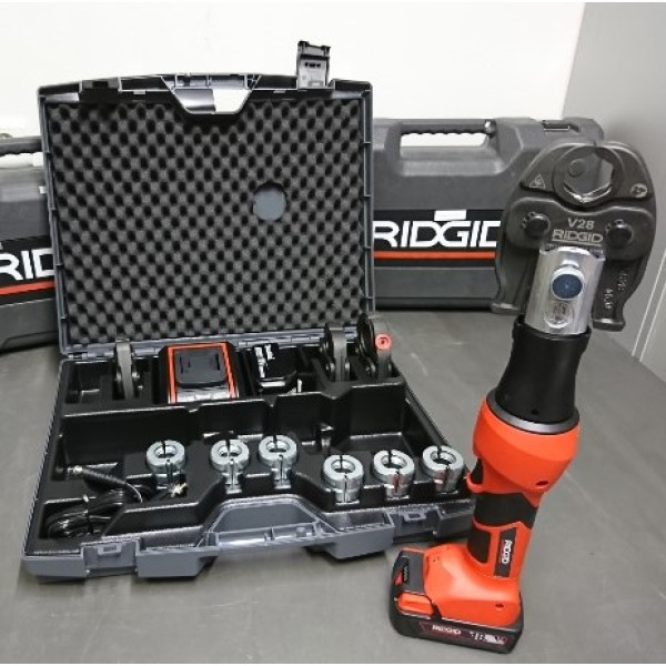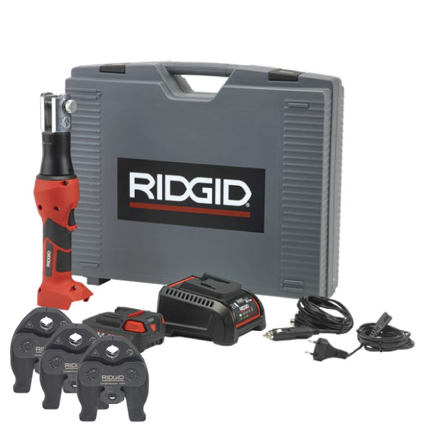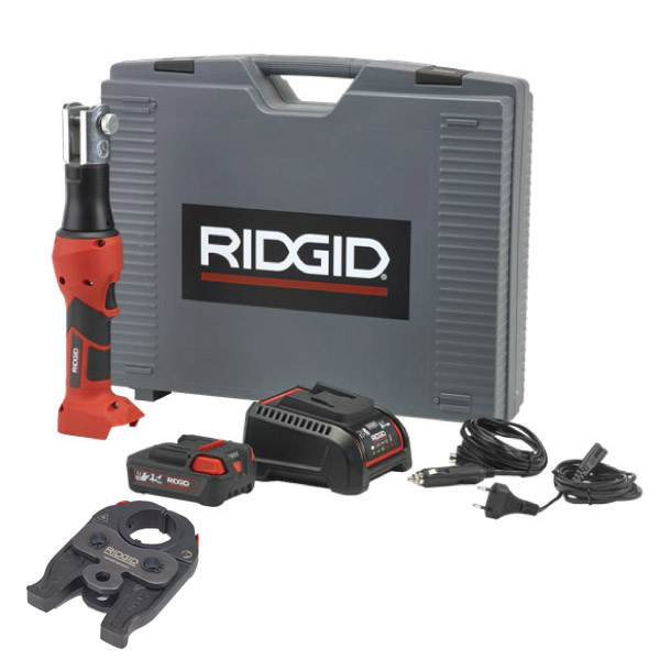 Lisovačku RIDGID MINI RP 219, Lisovací čelisti (podle setu), 1x Akumulátor 18V 2.5Ah, Rychlonabíječka 18V s napájením do sítě + 1x napájení nabíječky do auta, kufr